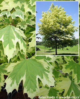 Acer platanoides ‘Drummondii’, cunoscut și sub numele de arțar norvegian ‘Drummondii’, este un arbore decorativ deosebit, apreciat pentru frunzișul său spectaculos. Cu o coroană largă și bine ramificată, acest cultivar se remarcă prin frunzele verzi, marginite elegant cu alb-crem, oferind un contrast vizual plăcut pe tot parcursul sezonului de vegetație.